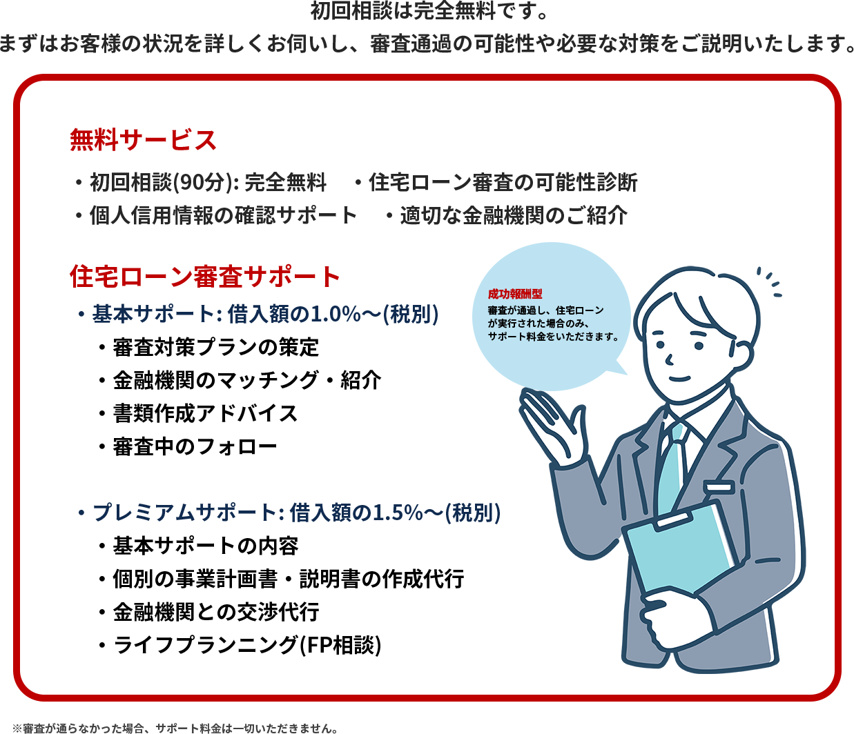住宅ローン審査でお悩みの方、まずは無料相談をご利用ください。