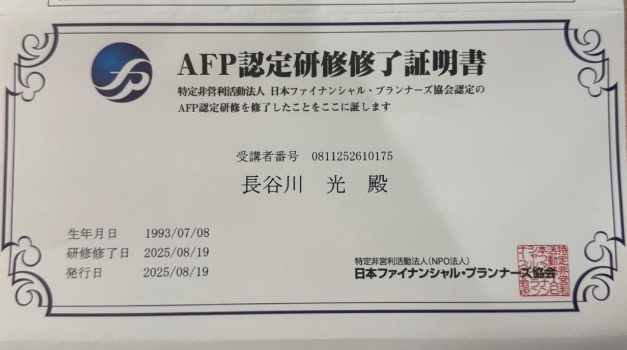 この度、ファイナンシャルプランナーAFP(Affiliated Financial Planner)資格を取得いたしました。