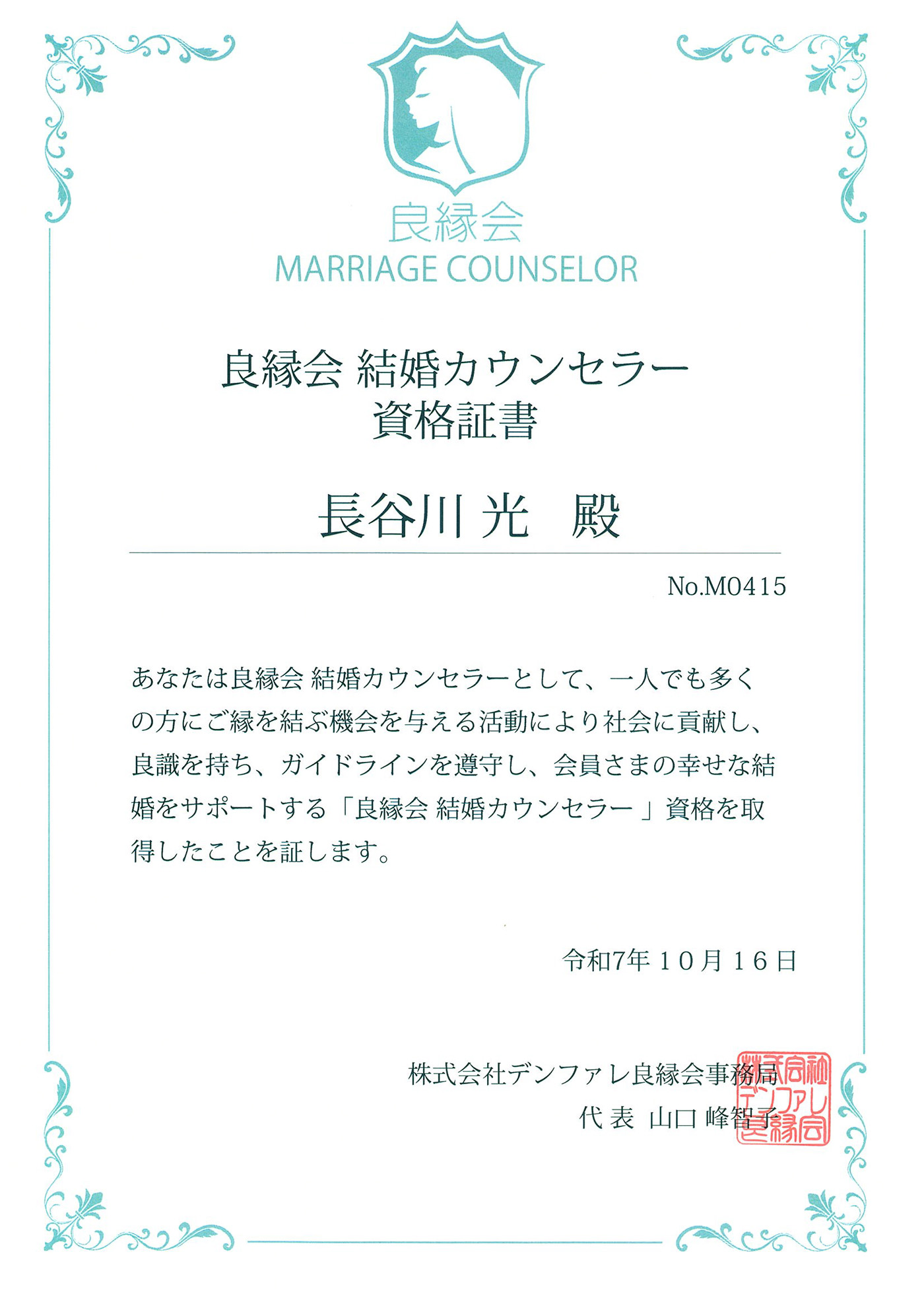 この度、代表の長谷川光が「良縁会 結婚カウンセラー」の資格を取得いたしました。